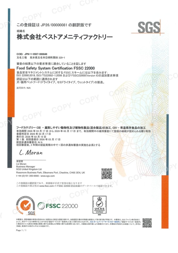 株式会社ベストアメニティファクトリー(本社:福岡県久留米市、代表取締役社長:村上 隆志)は、アニマル・ワンブランドのペットフードを製造する玉名工場(熊本県玉名市)において、食品安全マネジメントシステムの国際認証規格「FSSC22000」を2026年3月17日に取得いたしましたのでお知らせいたします。